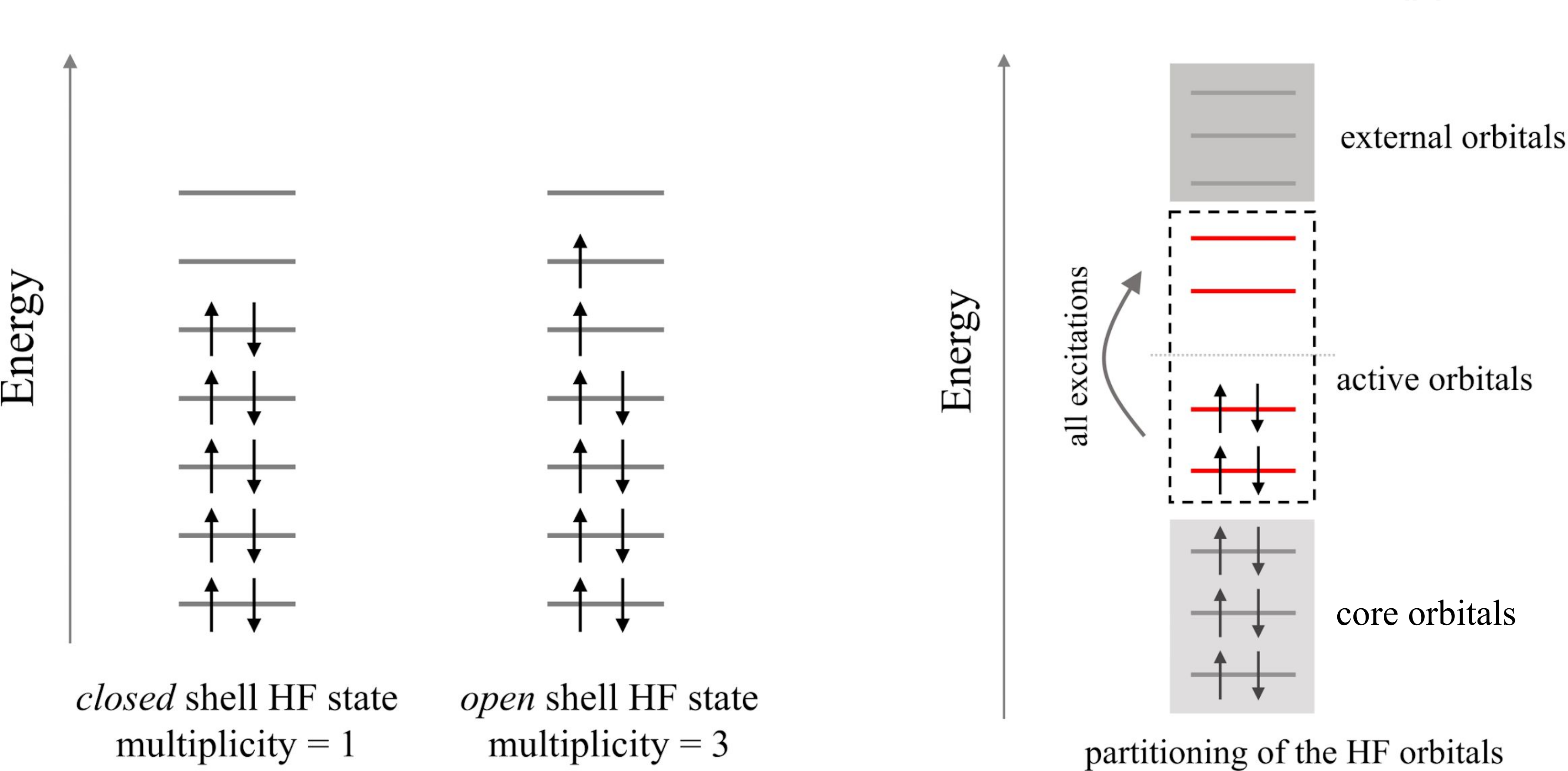 An active space can be defined for a given number of active electrons occupying a reduced set of active orbitals as sketched in the right panel of the figure below.